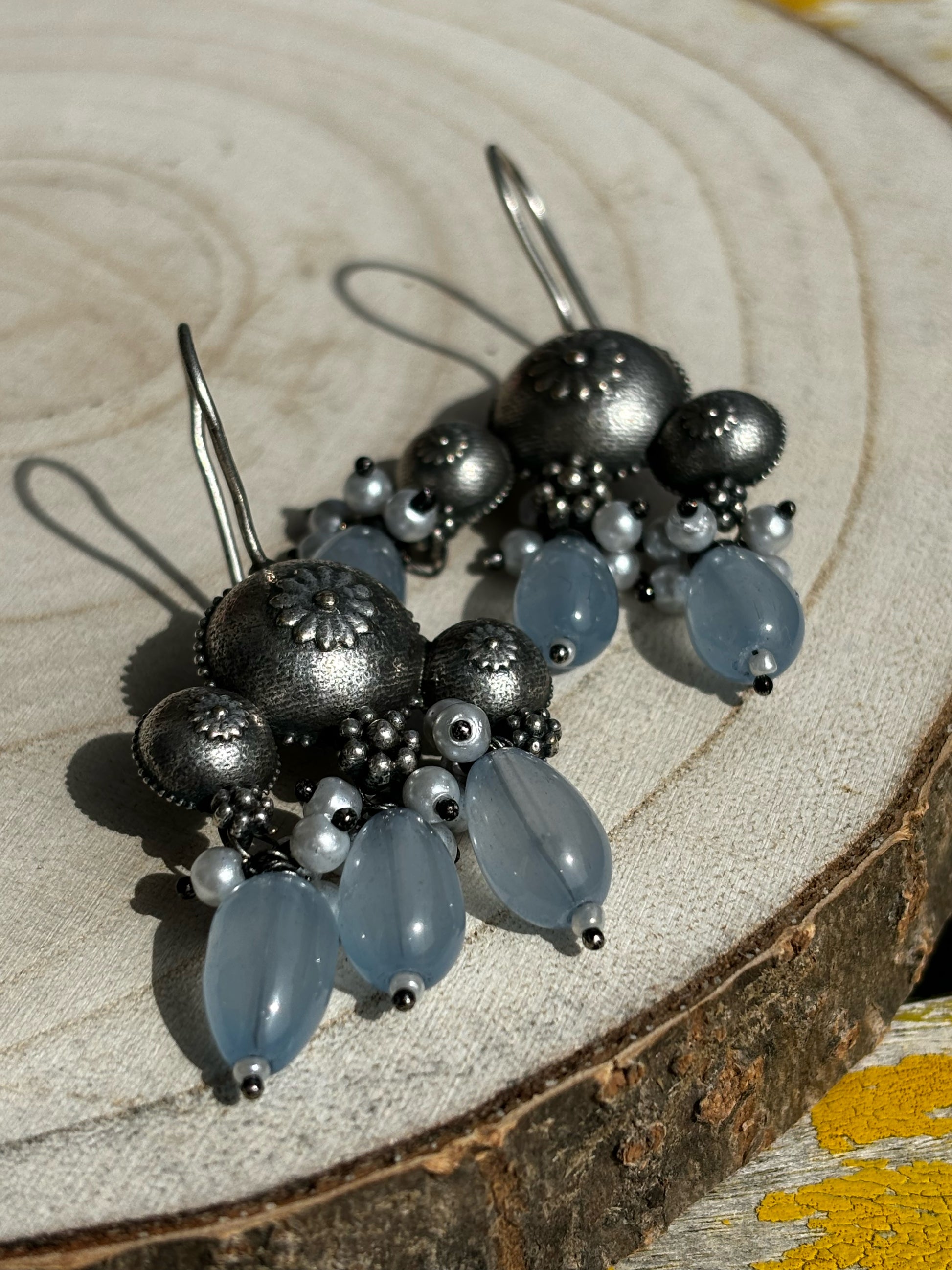The Ashen Earrings combine oxidised brass with smooth grey beads for a contemporary yet elegant look. Featuring a delicate floral stud and softly moving drops, they offer refined detail and balanced design. Their neutral tones complement a wide range of outfits, from casual knits and linen to polished evening wear. Lightweight and comfortable, these earrings are expertly crafted for effortless daily sophistication.