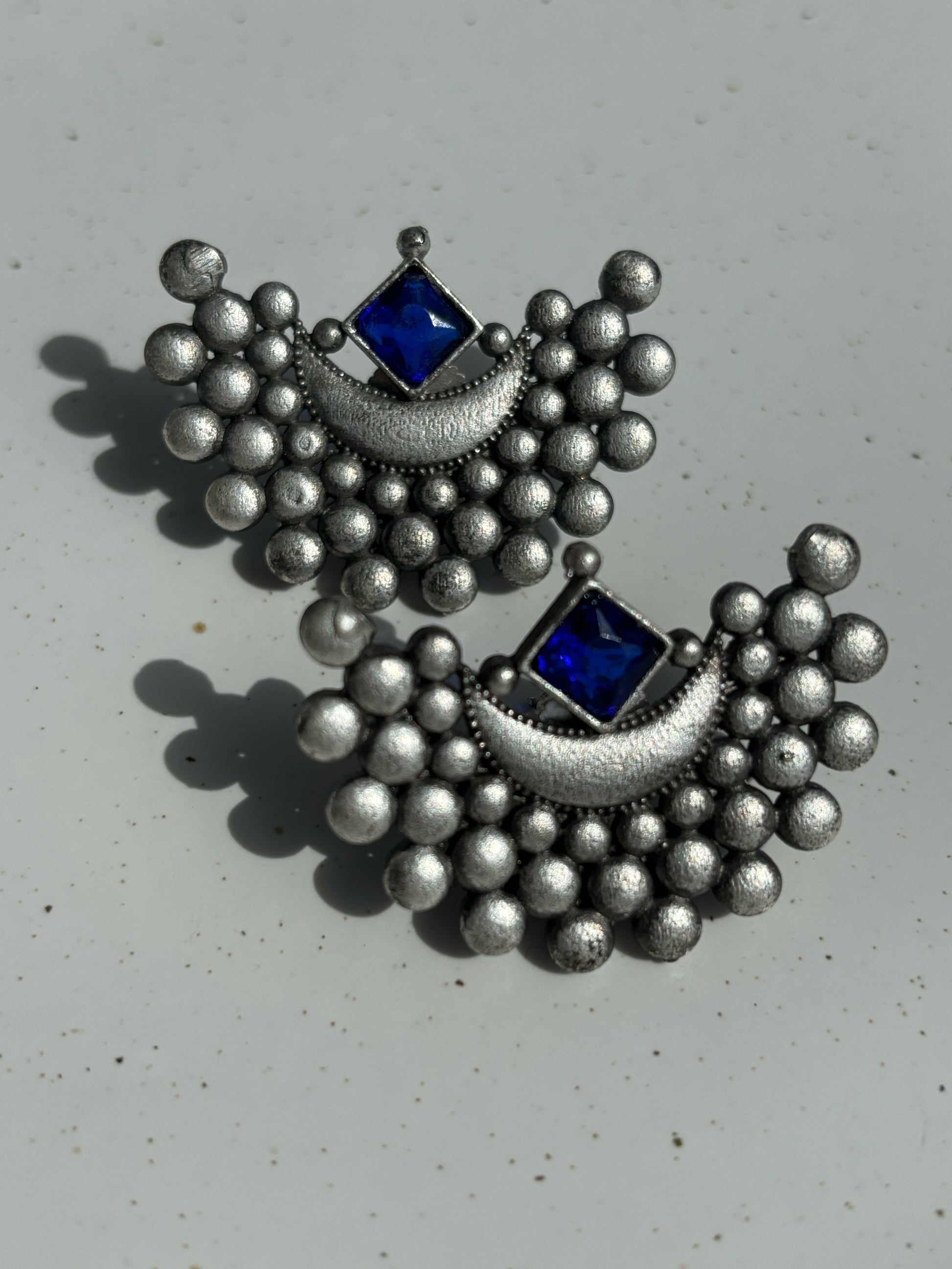 The Lunara Studs draw inspiration from the moonlit night sky, where silver crescents glow against deep shades of blue. Handcrafted in oxidised brass, these earrings feature a square-cut cobalt gemstone set above a detailed crescent, surrounded by intricate bead clusters. The bold yet elegant design makes them perfect for both modern styling and heritage-inspired looks.